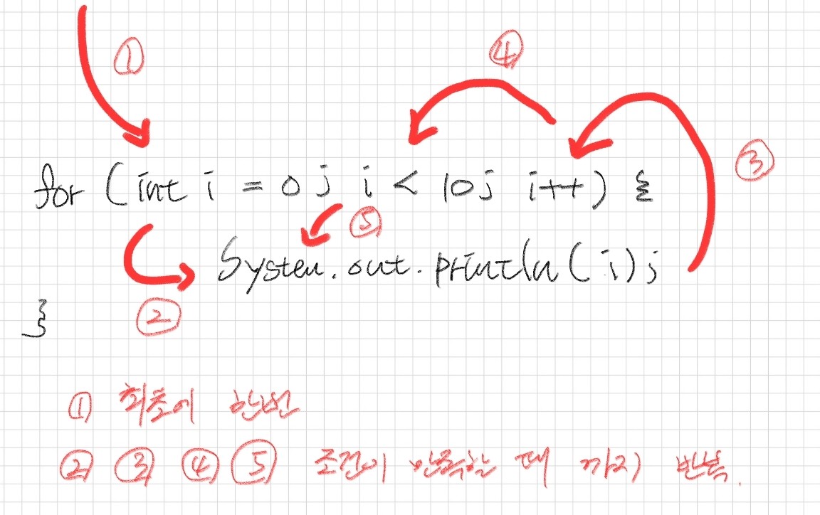 public class Exam10 { public static void main(String[] args) { for (int i = 0; i < 10; i++) { System.out.println(i); } } }초기의 값을 선언하여 해당 값이 조건에 충족되는 동안 loop를 반복한다. for은 loop의 횟수가 정해져 있을 때 유용하게 사용될 수 있다.