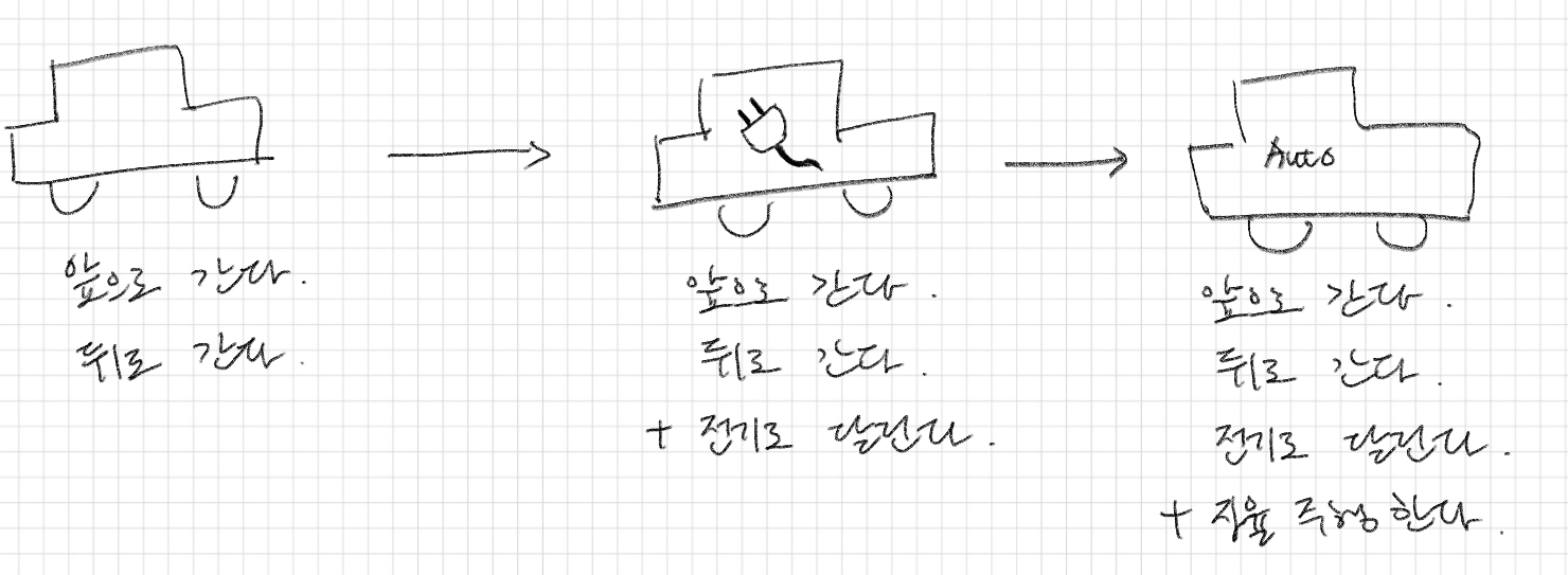 자동차의 기능을 상속하고 기능이 추가되어 구체화된다. 상속은 클래스 사이의 필드, 메소드의 중복 선언을 줄여준다. 또한 필드와 메소드를 재사용해서 클래스를 간결화한다. 마지막으로 클래스 간의 계층적 분류를 활용하여 관리에 용이하다.