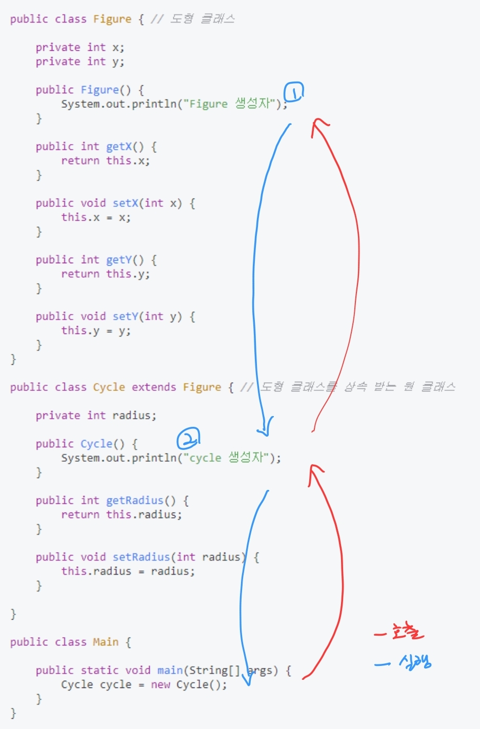public class Figure { // 도형 클래스 private int x; private int y; public Figure() { System.out.println("Figure 생성자"); } public int getX() { return this.x; } public void setX(int x) { this.x = x; } public int getY() { return this.y; } public void setY(int y) { this.y = y; } } public class Cycle extends Figure { // 도형 클래스를 상속 받는 원 클래스 private int radius; public Cycle() { System.out.println("cycle 생성자"); } public int getRadius() { return this.radius; } public void setRadius(int radius) { this.radius = radius; } } public class Main { public static void main(String[] args) { Cycle cycle = new Cycle(); } }main 함수를 실행하게 되면