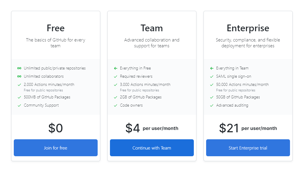 New organization 다양한 기능을 제공하는 Team과 Enterprice는 월마다 일정 금액을 사용해야 한다. 하지만 학교 프로젝트 진행을 위해 생성하였기 때문에 Free만 사용하여도 충분한 실습과 프로젝트를 진행할 수 있다.