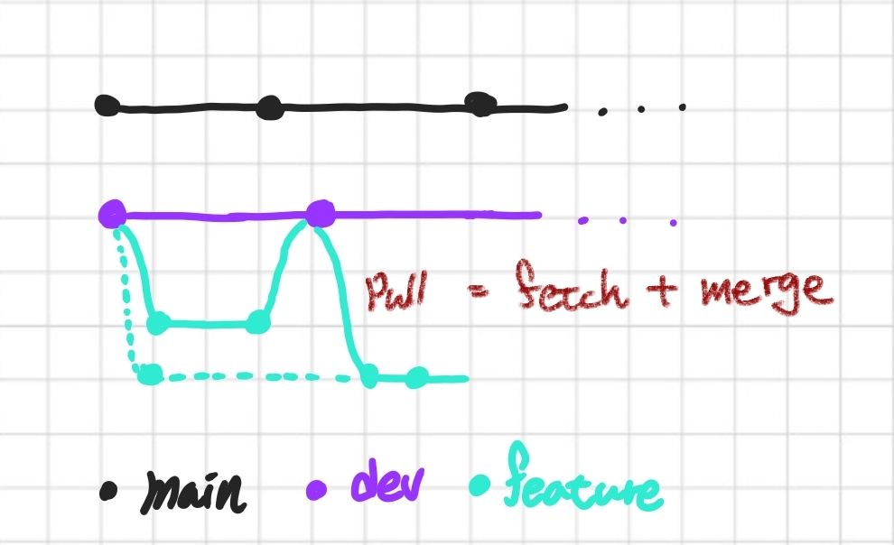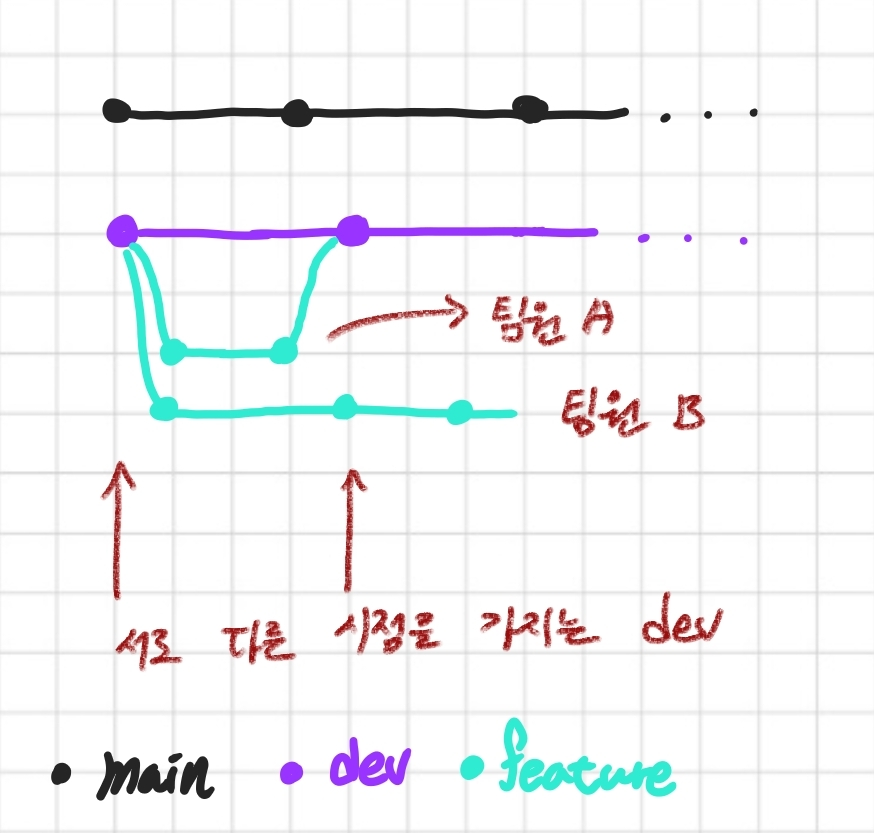 팀원 A와 팀원 B가 있다고 가정한다. 둘 다 dev의 같은 시점에 브랜치를 생성하여 작업을 진행하였다. 팀원 A의 기능 구현이 모두 끝난 후 pull request가 진행되고 dev에 성공적으로 merge 되었다. 팀원 B가 작업하던 시점과 달라진 것이다.