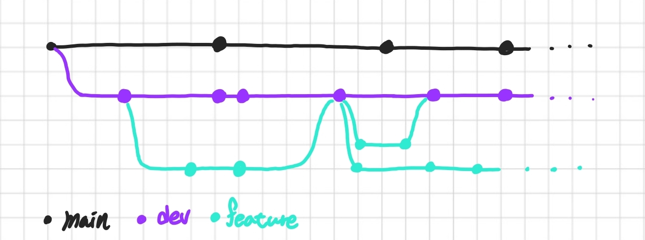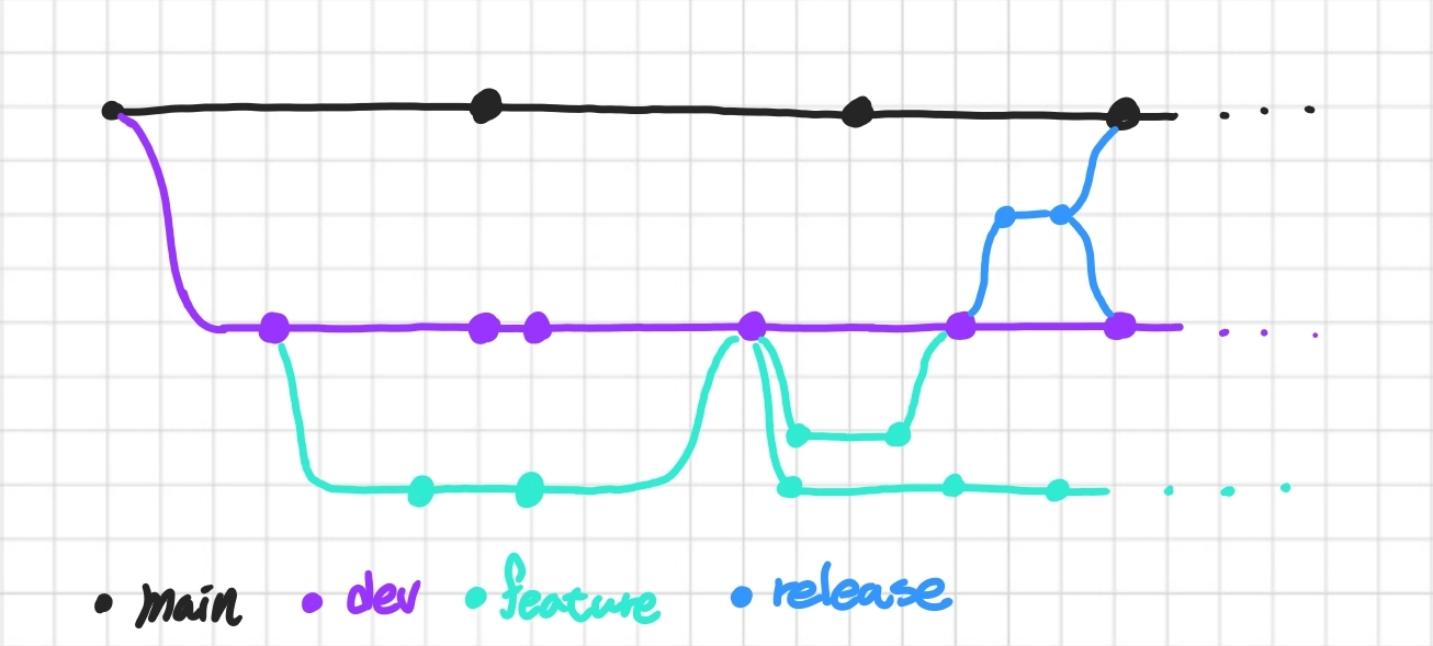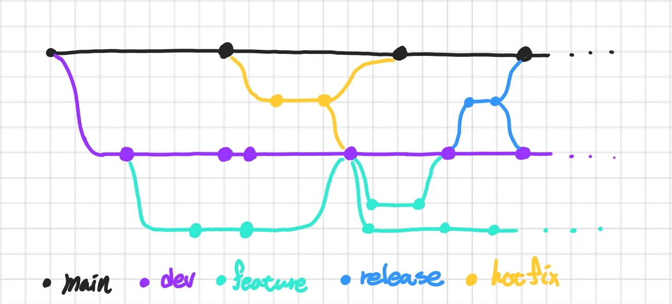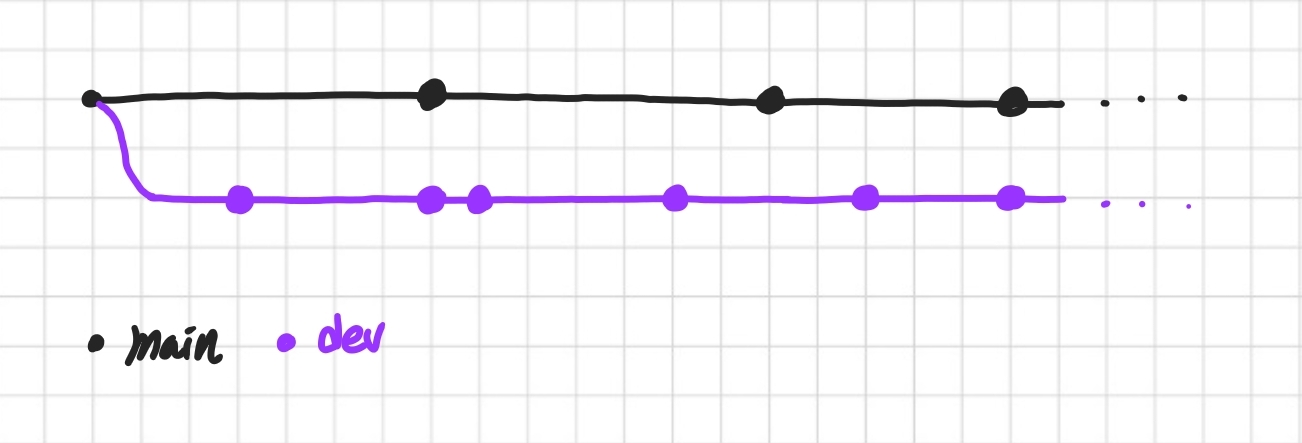 main과 dev 브랜치이다. 두 브랜치는 항시 운영되어야 하는 브랜치이다. dev는 개발을 위한 브랜치이고, main은 제품으로 출시될 수 있는 브랜치 이기 때문에 항시 배포 가능한 상태이어야 한다.