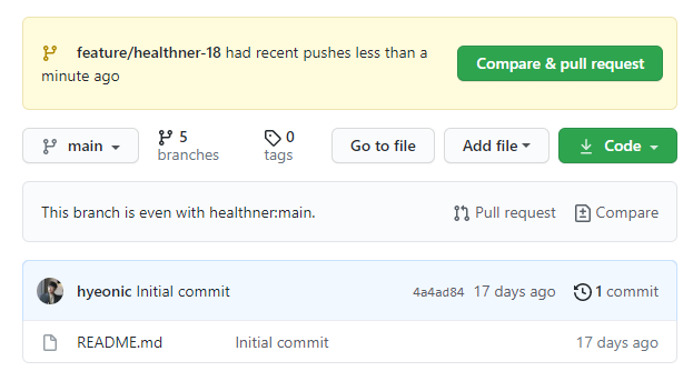 $ git push origin feature/healthner-18그렇게 github repository를 살펴보면 변경을 감지하고 pull request를 생성할 것인지에 대한 탭을 확인할 수 있다.