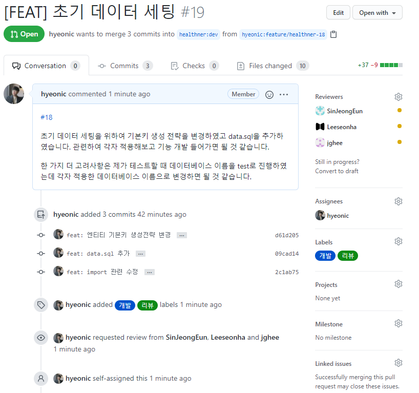 이제 생성한 PR을 기반으로 코드리뷰를 진행한다. 변경 사항이 적용되면 dev에 반영하기 위해 merge한다.