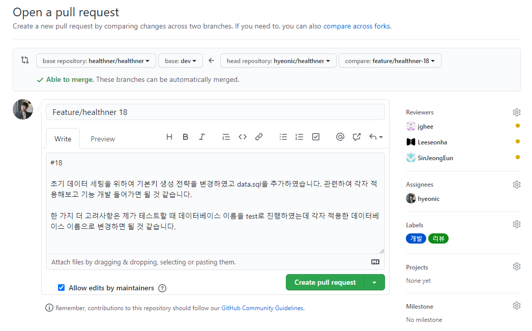 feature/{repository 이름}-18 브랜치를 dev에 merge하기 위한 pull request를 진행하는 예시이다. 작성한 코드를 리뷰해줄 팀원들을 선택하고, commit한 코드의 내용을 간단히 요약하여 작성한다.