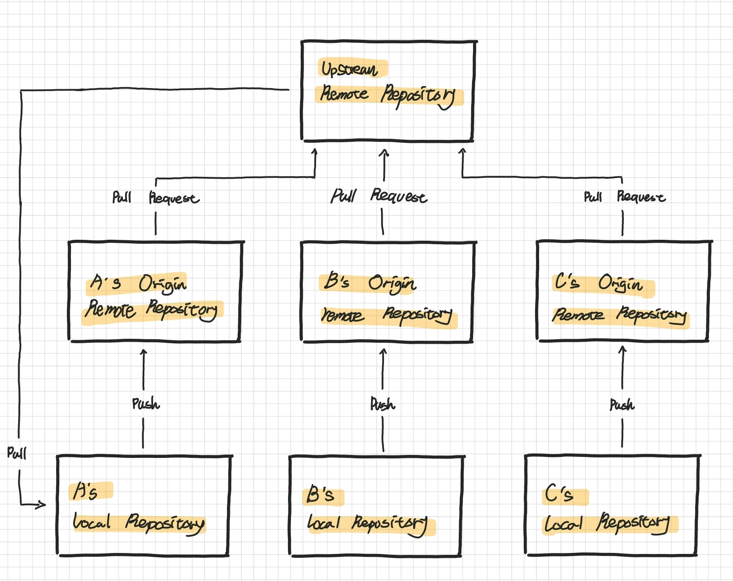 이렇게 두 개의 remote repository로 나눈 이유는 Upstream repository의 경우 팀원이 공유하고 있는 Repository이기 때문에 다양한 시도를 하기에 큰 위험 부담을 가지고 있다. 각자의 개인 repository에서 작업을 시도한 후 적절한 기능 merge 하기 위해 Pull Request를 요청한다.