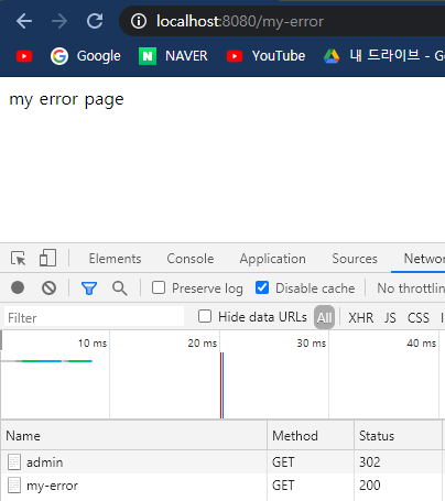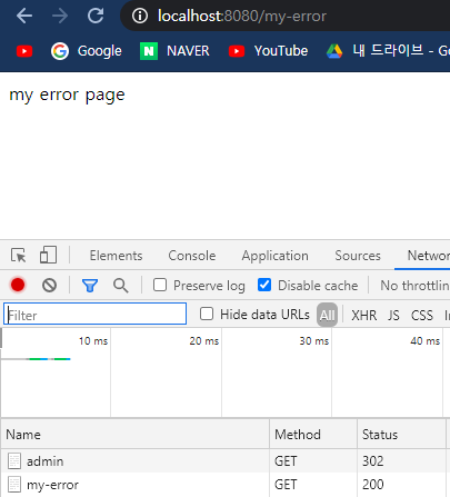 admin page 접근 시도 -> 실패 my-error redirect (302)