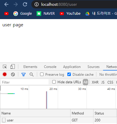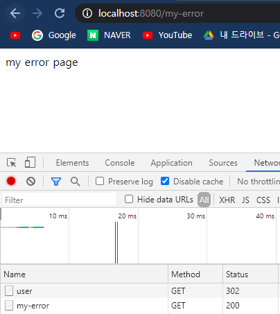 import me.hyeonic.springinterceptor.interceptor.MySecured; import me.hyeonic.springinterceptor.interceptor.Role; import org.springframework.web.bind.annotation.GetMapping; import org.springframework.web.bind.annotation.RequestMapping; import org.springframework.web.bind.annotation.RestController; @RestController @RequestMapping("/user") public class UserController { @MySecured(role = Role.USER) @GetMapping public String user() { return "user page"; } }간단한 로직 확인을 위해 추가한 Controller이다. 직접 만든 annotation 확인을 위하여 @MySecured를 Admin와 User Controller에 구분하여 달아두었다. 로그인을 하고 난 후 해당 handlerMethod에 접근하려 할 때 my-error page로 적절히 redirect 되는지 확인한다.