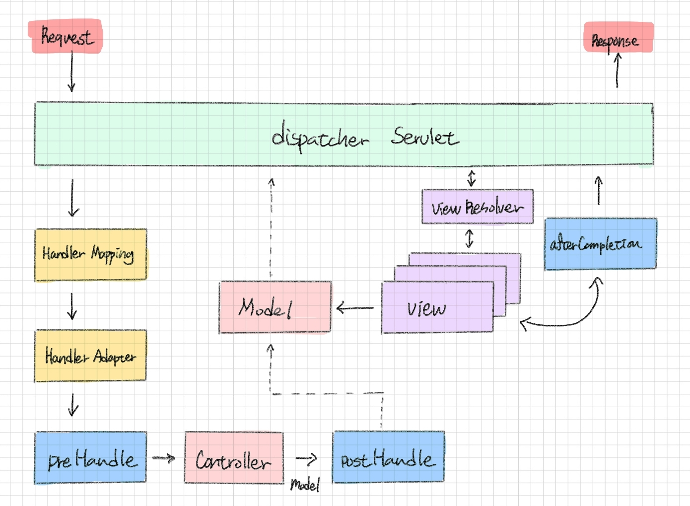 interceptor 흐름도 interceptor는 위와 같은 흐름으로 Controller(Handler) 로 가기전에 요청을 가로채는 preHandle, controller 처리 후 postHandle, 마지막으로 전체 요청이 끝난 후 처리되는 afterCompletion 으로 이루어져 있다.