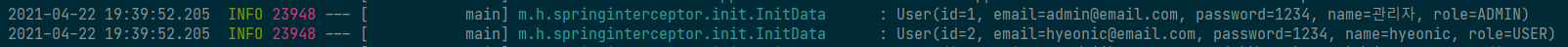 import lombok.RequiredArgsConstructor; import lombok.extern.slf4j.Slf4j; import me.hyeonic.springinterceptor.domain.Posts; import me.hyeonic.springinterceptor.interceptor.Role; import me.hyeonic.springinterceptor.domain.User; import me.hyeonic.springinterceptor.repository.PostsRepository; import me.hyeonic.springinterceptor.repository.UserRepository; import org.springframework.stereotype.Component; import javax.annotation.PostConstruct; import java.util.List; @Component @RequiredArgsConstructor @Slf4j public class InitData { private final UserRepository userRepository; private final PostsRepository postsRepository; @PostConstruct public void init() { User admin = new User("admin@email.com", "1234", "관리자"); admin.setRole(Role.ADMIN); userRepository.save(admin); User hyeonic = new User("hyeonic@email.com", "1234", "hyeonic"); hyeonic.setRole(Role.USER); userRepository.save(hyeonic); List<User> users = userRepository.findAll(); for (User user : users) { log.info(user.toString()); } } }@Component로 인하여 자동으로 Bean에 등록된다. @PostConstruct로 InitData가 객체로 생성되는 시점에 초기화작업으로 한 번 실행된다. 서버가 실행되는 시점에 해당 메소드가 실행되어 두개의 user를 생성한다.