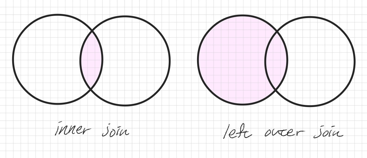 inner join과 left outer join을 표현한 그림이다. inner join은 두 테이블에 같은 값만 가져오고, left outer join의 경우 왼쪽에만 값이 있어도 조회되는 큰 차이가 있다. 만약 값이 없다면 단순히 null 값을 채워진 채로 조회된다.