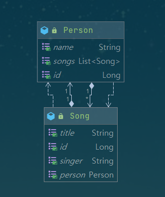 Person은 사람을 나타내는 엔티티 클래스이고 Song은 person이 선택한 노래를 playList에 담기 위한 엔티티 클래스이다.