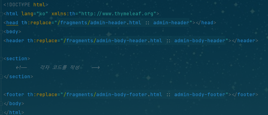 현재 프로젝트 구조를 보면 html의 head 부분과 body의 header, footer 부분을 fragments로 나누어 사용하고 있다.