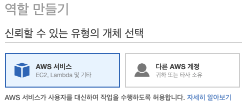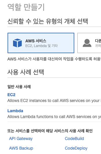CodeDeploy의 경우 AWS 서비스인 ec2를 사용할 것이기 때문에 역할로 처리한다.