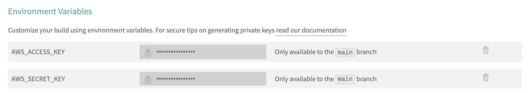 Enviroment Variables에 아까 발급 받은 엑세스 키를 각각 등록 시켜준다. 이렇게 등록된 값들은 .travis.yml에서 자유롭게 사용할 수 있다.