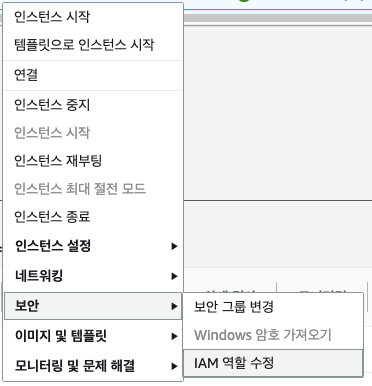 이제 생성한 역할을 ec2에 등록해야 한다. ec2 서비스에 생성된 인스턴스를 우클릭한다.