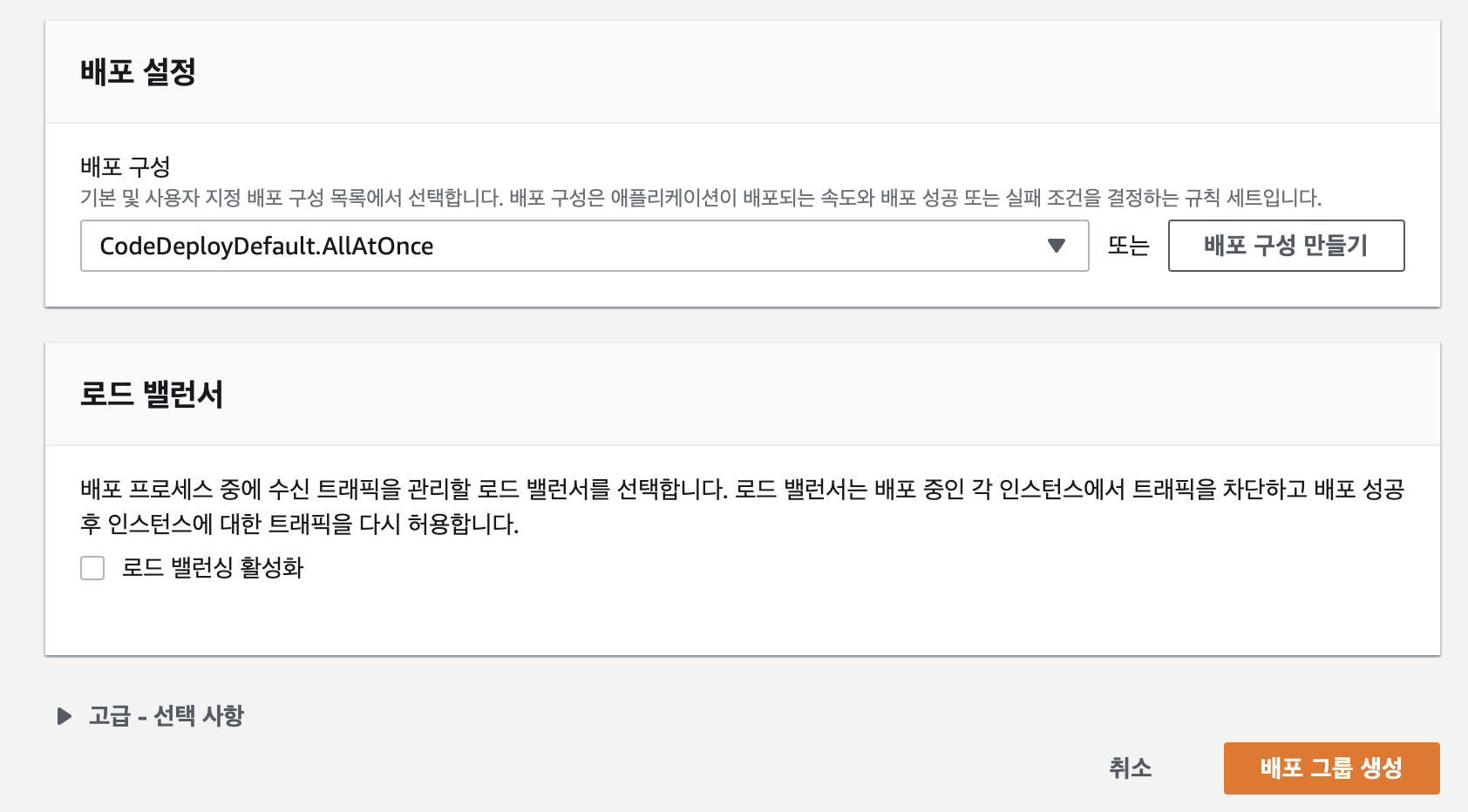 배포 구성을 선택하고 로드 밸런서 체크를 해제한다. 배포 그룹 생성을 클릭하면 배포 그룹 생성이 완료된다.