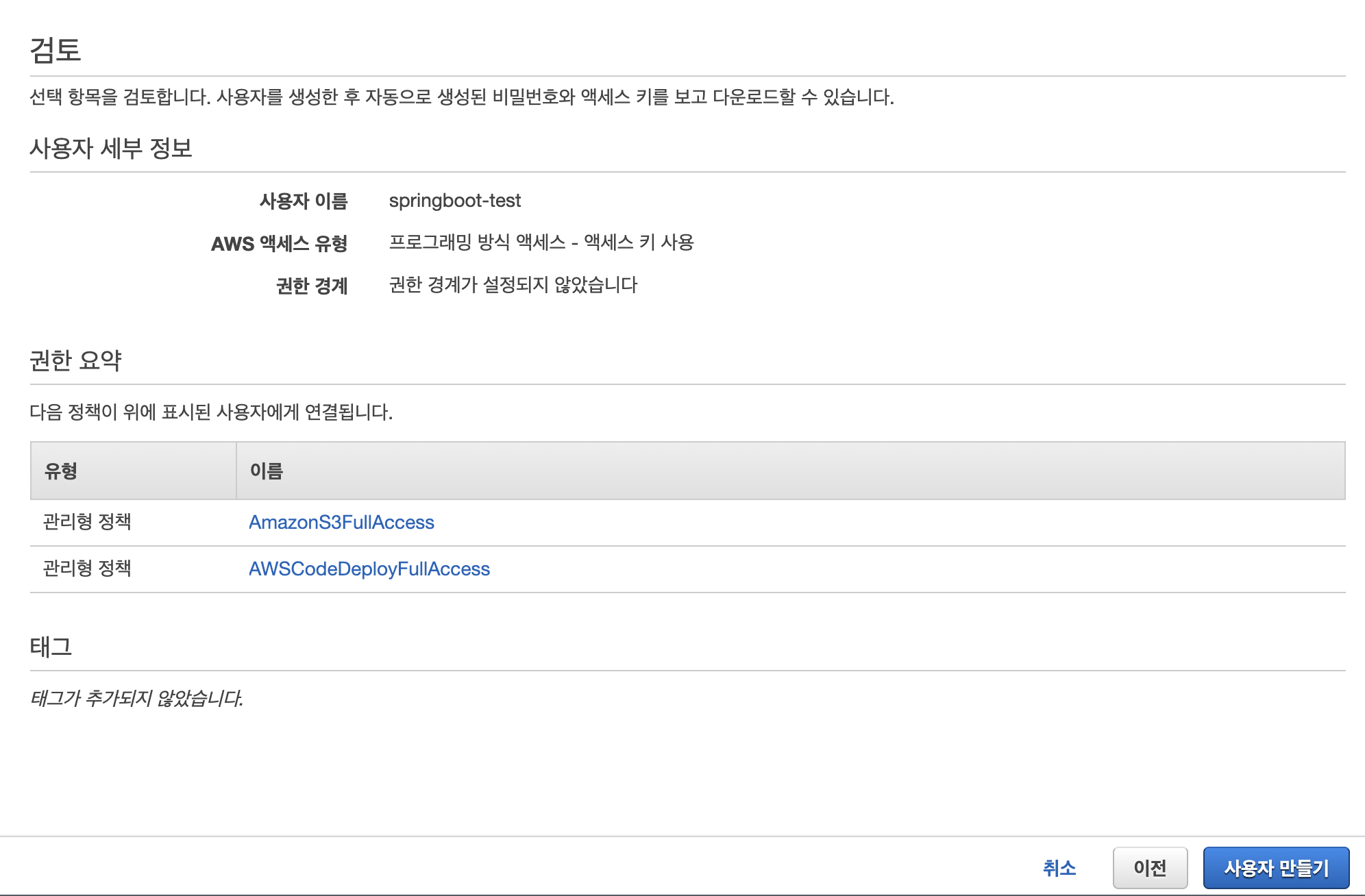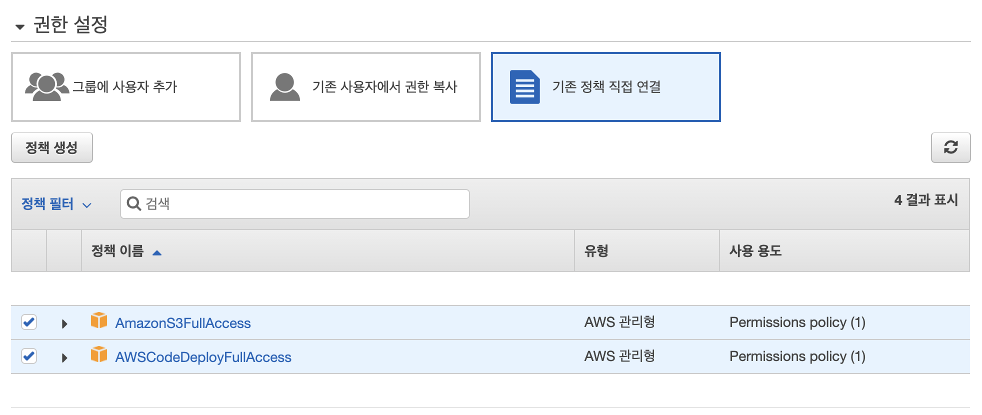 권한 설정에서 기존 정책 직접 연결을 클릭하고 AmazonS3FullAccess와 AWSCodeDeployFullAccess 권한을 추가한다.