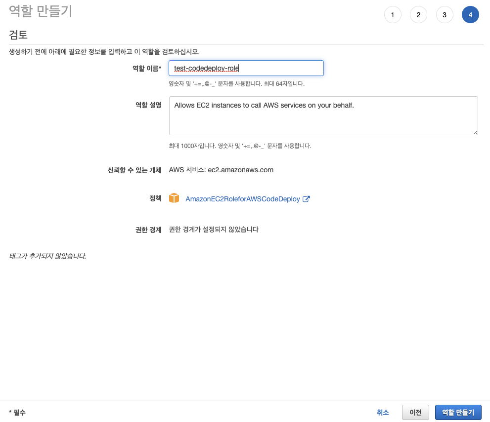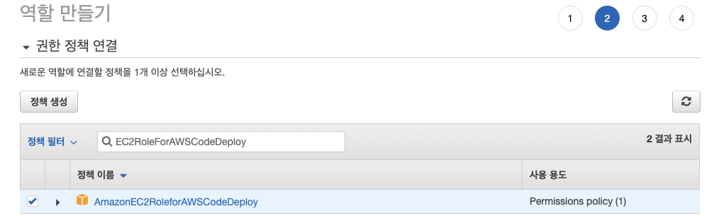 EC2RoleForAWSCodeDeploy를 선택하고 넘어간다.