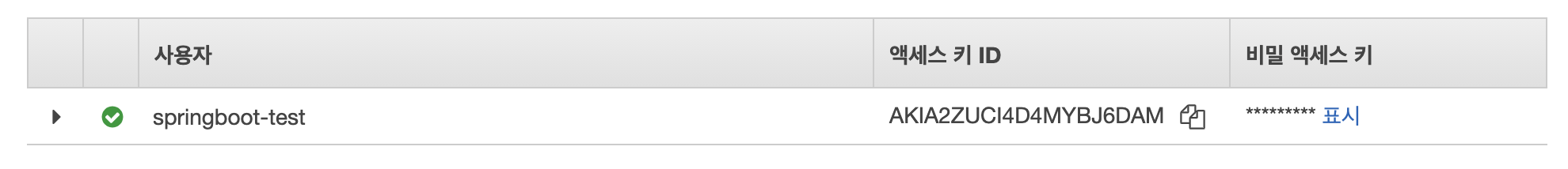 생성이 완료되면 엑세스 키 ID와 비밀 엑세스 키를 확인할 수 있다. 이 두 가지의 값이 Travis CI의 환경 변수로 등록되어 AWS의 접근을 허용하게 해주는 key 역할을 하게 된다.