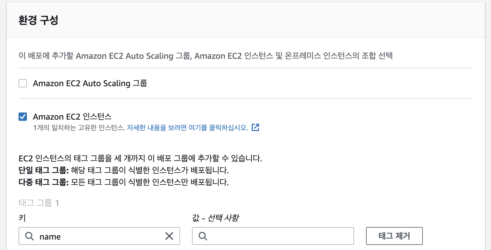 환경 구성에서 Amazon EC2 인스턴스를 클릭한다. 추가적으로 기호에 따라 태그를 작성한다.