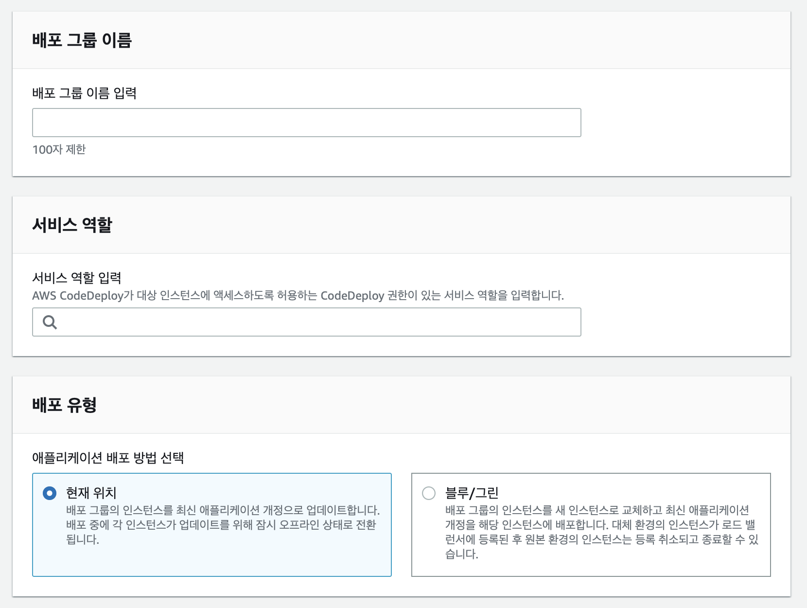 배포 유형은 배포할 서비스가 2대 이상이면 블루/그린을 선택하고 아니라면 현재 위치를 선택한다.