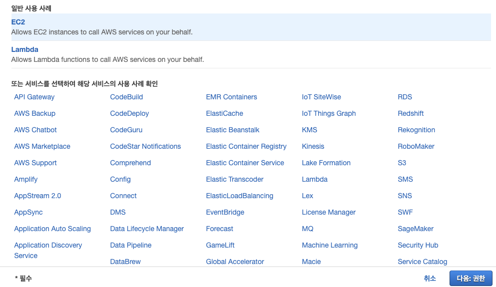 EC2를 클릭하고 다음: 권한을 클릭한다.