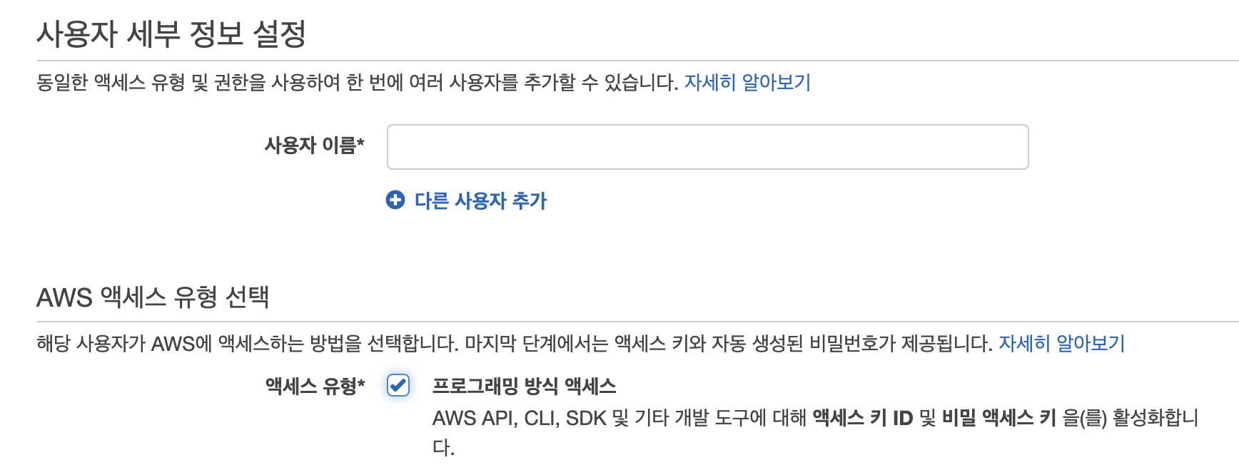 사용자 추가를 눌러 생성할 사용자의 이름과 엑세스 유형을 선택한다.