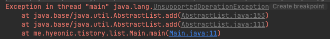 List<Integer> list = Arrays.asList(1, 2, 3);하지만 일반적인 list와는 큰 차이가 있다. 그것은 일반적인 list처럼 데이터를 추가하거나 삭제할 때 확인할 수 있었다.