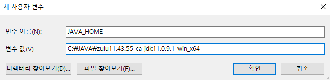 C:\JAVA\zulu11.43.55-ca-jdk11.0.9.1-win_x64이제 JDK를 설치한 디렉토리를 가리키는 JAVA_HOME 환경변수를 만들어야 한다. eclipse, InIntelliJ와 같은 idea는 기본적으로 JAVA_HOME 환경변수를 사용한다.