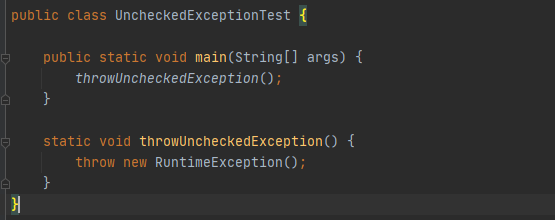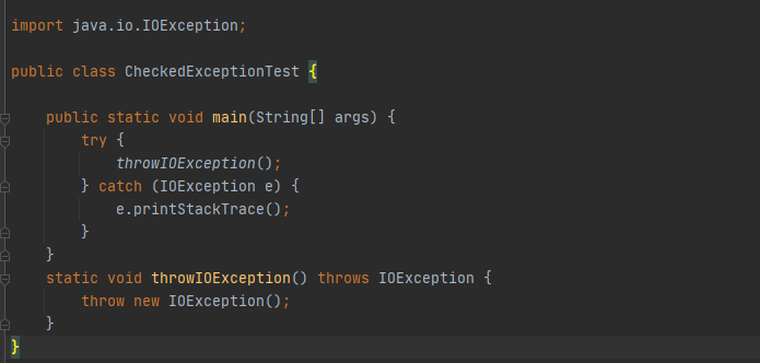 public static void test() throws Exception { Exception e = new Exception("의도적인 예외"); throw e; }throw를 사용한 시점에서 무조건 예외가 발생한다. 이 예외는 try-catch로 처리하거나 혹은 throws 키워드를 사용하여 메소드를 사용한 곳에 예외를 던져줘야 한다.