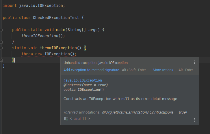 발생할 가능성이 있는 메소드라면 반드시 코드를 try-catch로 감싸거나 throws로 던져서 처리해야 한다. 밑은 Checked Exception의 한 종류인 IOException이다. 컴파일 에러가 발생한 것을 알 수 있다.