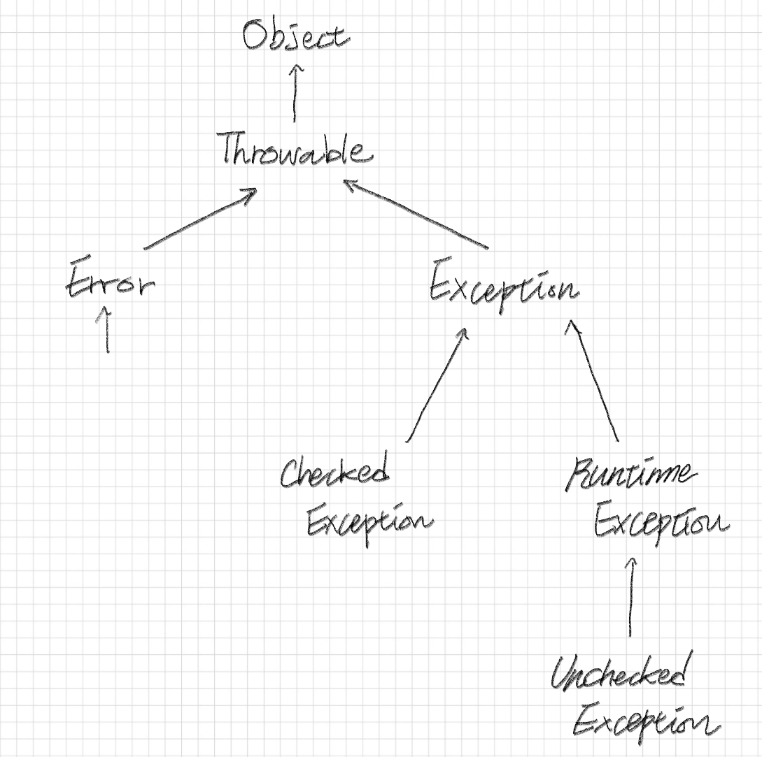 모든 예외클래스는 Throwable 클래스를 상속받는다. Throwable을 상속받는 클래스는 Error와 Exception이 있다. Error는 시스템 레벨의 심각한 수준의 에러이기 때문에 시스템에 변화를 주어 문제를 처리해야 한다. 반면 Exception은 개발자가 코드를 추가하여 처리가 가능하다.