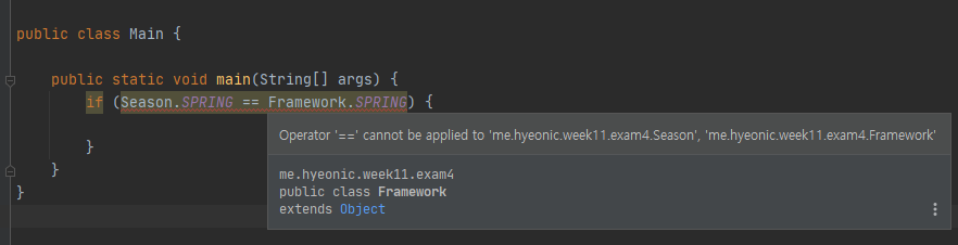 public class Exam03 { // season static final int SEASON_SPRING = 1; // framework static final int FRAMEWORK_SPRING = 1; public static void main(String[] args) { System.out.println(SEASON_SPRING == FRAMEWORK_SPRING); // true } }계절의 SPRING과 framework의 SPRING은 서로 비교할 수 없는 완전히 다른 개념이다. 그렇기 때문에 작성할 수 없게 컴파일 과정에서 막아야 한다.