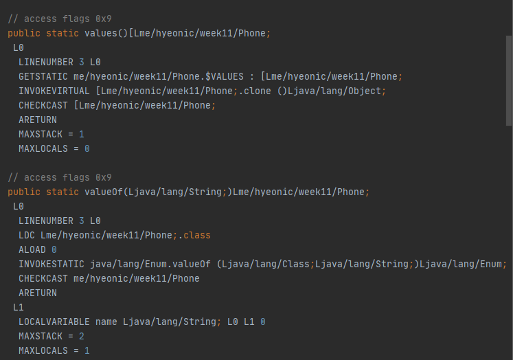 public final enum me/hyeonic/week11/Phone extends java/lang/Enum { // compiled from: Phone.java // access flags 0x4019 public final static enum Lme/hyeonic/week11/Phone; GALAXY_S21 // access flags 0x4019 public final static enum Lme/hyeonic/week11/Phone; GALAXY_S21_PLUS // access flags 0x4019 public final static enum Lme/hyeonic/week11/Phone; GALAXY_S21_ULTRA // access flags 0x4019 public final static enum Lme/hyeonic/week11/Phone; GALAXY_Z_FLIP // access flags 0x4019 public final static enum Lme/hyeonic/week11/Phone; GALAXY_Z_FOLD2 ...바이트코드를 살펴보면 java.lang.Enum을 상속한 것을 확인 할 수 있다.