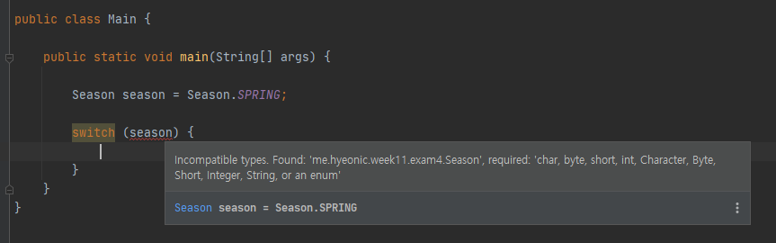 public class Season { public static final int SPRING = 1; public static final int SUMMBER = 2; public static final int FALL = 3; public static final int WINTER = 4; public static void main(String[] args) { int season = SPRING; switch (season) { case SPRING: System.out.println("봄"); break; case SUMMBER: System.out.println("여름"); break; case FALL: System.out.println("가을"); break; case WINTER: System.out.println("겨울"); break; } } }봄첫 번째 문제를 확인하기 위해 간단하게 봄, 여름, 가을, 겨울을 1, 2, 3, 4라는 리터럴로 구분하여 부여하였다. 해당 리터럴은 단순히 상수를 구분하는 용도이고 논리적으로는 아무 의미가 없다. 즉 season 변수에 1이라는 값을 넣어도 SPRING을 넣었을 때랑 값을 결과가 나올 수 있다. 결국 상수와 상수에 부여된 리터럴들은 연관성이 없다는 것을 알 수 있었다.