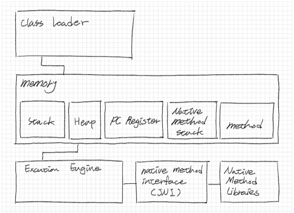 Class Loader를 통하여 바이트코드를 JVM내로 로드하고 Execution Engine에서 두 가지 방식을 활용(interpreter, JIT)하여 기계어로 바꿔준다.