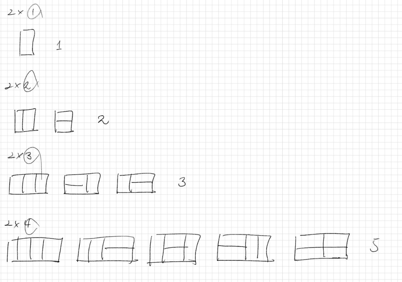 2×n 크기의 직사각형을 1×2, 2×1 타일로 채우는 방법의 수를 구하는 프로그램을 작성하시오. 아래 그림은 2×5 크기의 직사각형을 채운 한 가지 방법의 예이다.