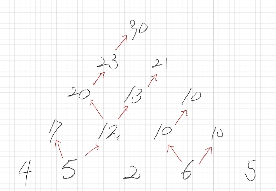 - 맨 위층 시작해서 아래에 있는 수 중 하나를 선택하여 아래층으로 내려올 때, 이제까지 선택된 수의 합이 최대가 되는